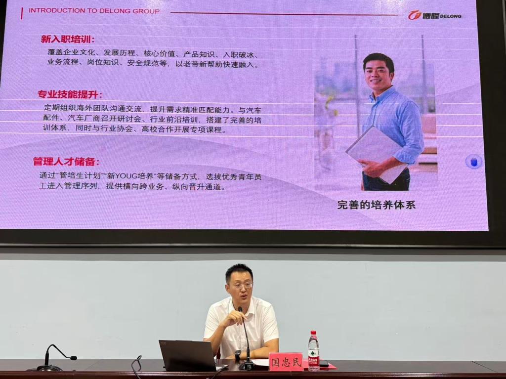 在宣讲环节中,山东省德隆再生资源科技集团有限公司总经理国忠民结合企业丰富的外贸实战经验,围绕“岗位需求—职业成长—行业未来”这一主线进行了全面分享。他详细解读了外贸岗位所必需的核心能力,包括跨语言沟通与国际商务谈判等,并借助真实企业案例,清晰梳理了从业务专员到高级经理的典型职业发展路径。此外,他还就当前全球贸易格局下的行业新机遇进行了深入分析,为qy球友会官方网站学生的就业方向提供了清晰指引。在宣讲尾声的互动环节中,国忠民总经理聚焦毕业生普遍关注的求职痛点,就外贸类岗位的简历优化、面试常见场景应答等提供了实用建议,并对行业薪资结构、不同类型企业间的差异等问题进行了细致解答。