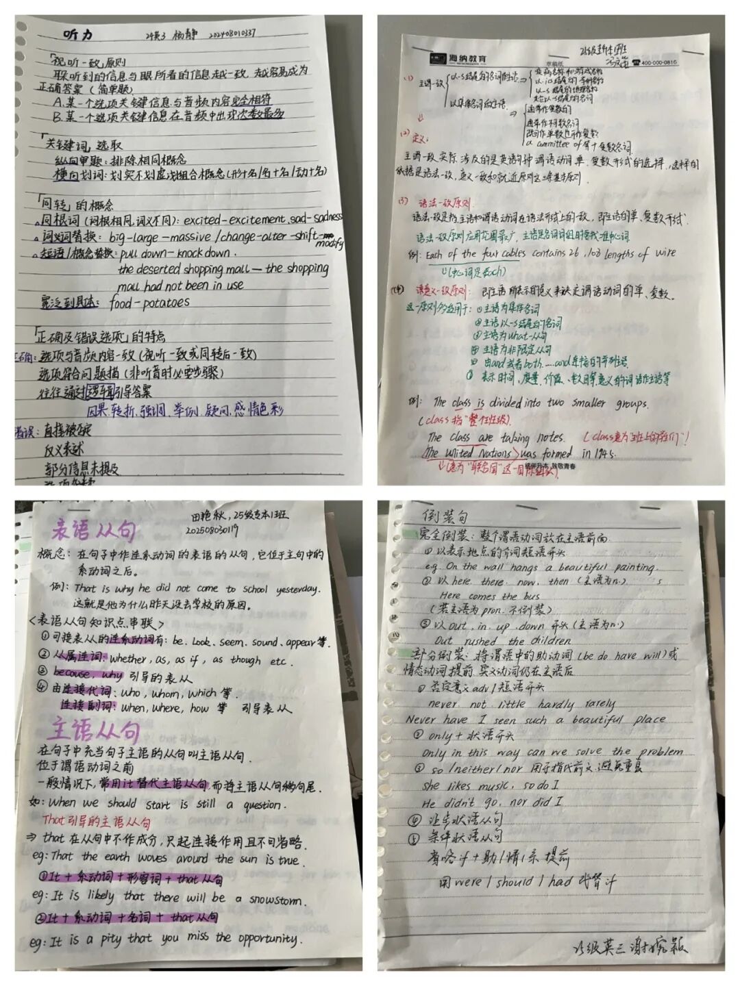 本次活动征集分为课堂笔记与备考计划两大类别。课堂笔记主要是单词整理、语法总结等基础内容;备考计划则围绕四六级考试、新学期课程预习等现阶段学习目标展开。自活动启动以来,各年级同学积极响应,提交的作品真实反映了大家平时的学习状态,也展现了良好的学习习惯。