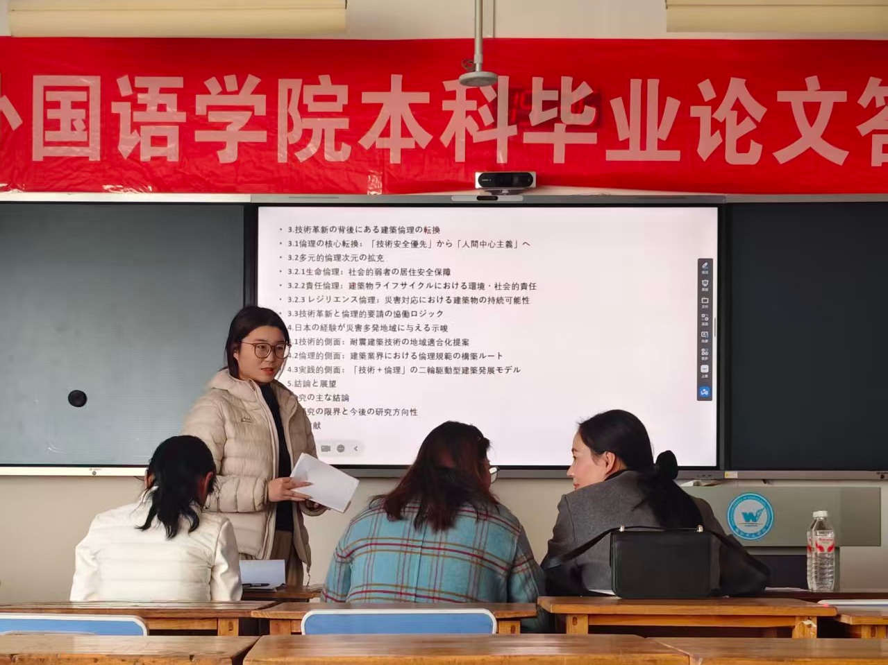 答辩过程中,毕业生们以专业为依托,围绕选题背景、研究意义、理论框架及研究方法展开系统陈述。从经典文学作品的时代价值重释,到语言习得理论与教学实践的深度结合,再到跨文化交际现象的多视角剖析,学生们凭借扎实的专业基础与严谨的学术态度,呈现出开阔的学术视野与鲜明的创新思维,充分体现了学院对学子学术素养的培养成效。