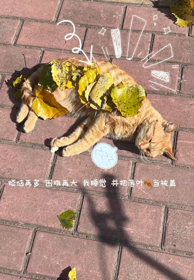 活动中,同学们化身“生活观察员”,用镜头定格校园温暖场景。或于午后阳光里,记录萌猫与落叶的灵动互动;或在校园角落间,捕捉银杏金径的诗意画面。这些多元的温暖场景通过影像汇聚成情感的纽带,同学们在观察与体悟中激发了创作灵感,实现了彼此的心灵疗愈。
