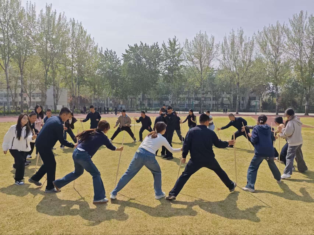 活动当天,操场上气氛热烈,各参赛队伍斗志昂扬、默契配合。在跳大绳环节,同学们随着长绳的起落同步跳跃,每一次成功越过都赢得了队友的阵阵掌声;传球接力赛中,大家手持道具,小心翼翼地将小球稳稳传递,即使偶有失误,也总能听到彼此鼓励的话语,并迅速调整状态重新投入比赛;不倒森林挑战则考验着团队的协调与反应,队员们围成一圈,随着口令同步移动,在松开自己手中长杆的瞬间,迅速上前按住前方队友的杆,确保“杆动人不乱、林倒心不散”,现场口令声与欢笑声交织,同学们的默契配合引来阵阵欢呼。这环环相扣的三个项目,不仅有效培养了同学们的团队协作意识,也让大家在欢声笑语中释放了压力,增进了彼此间的信任。